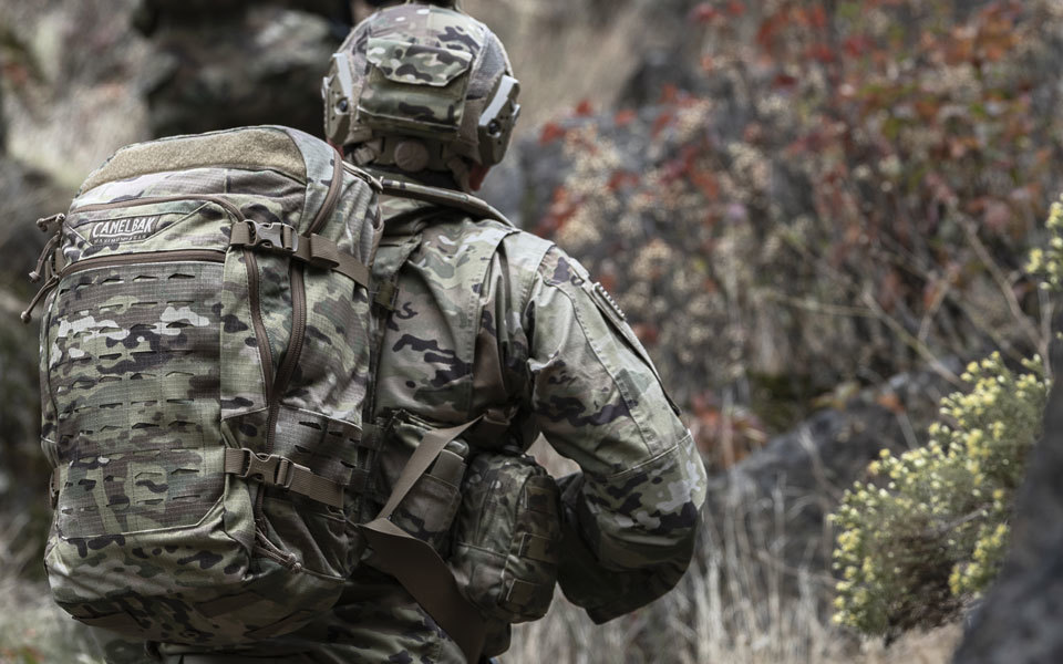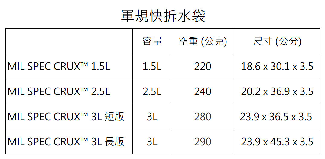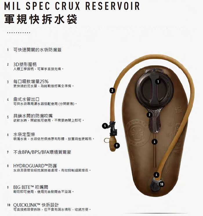 • 軍規Crux™水袋符合USMC補水系統規範,具延展性與防穿刺爆裂