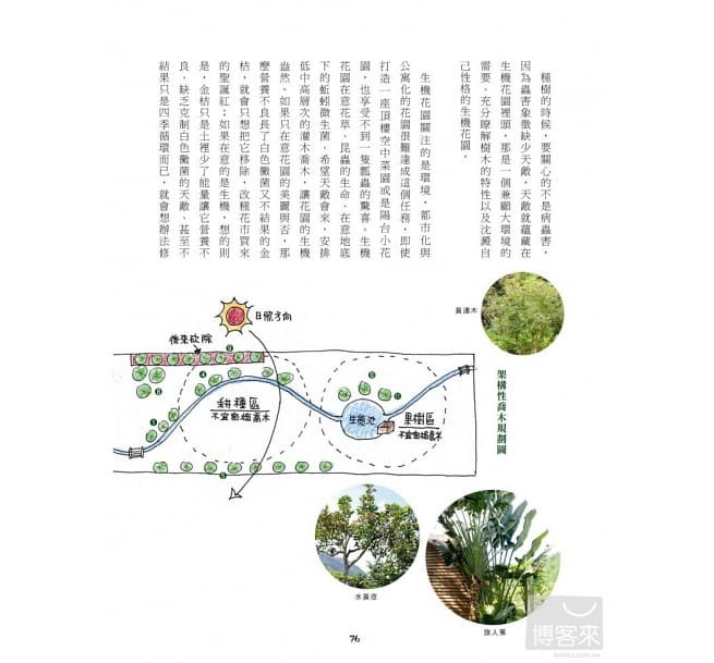 不過,這並不是說,要讀者依書中的設計方式、照表操課,畢竟,設計總是在不停的微調之中更趨完美。因此,重點是學習作者的土地設計SOP,以及他的初衷──對土地良善的態度。至於如何設計、種植什麼,要再依照每塊地的現況而有不同解答了。