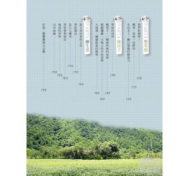 從空無一物的農地開始,引進自然流水,種樹種籬種草,然後才種房子。我們開了草原便利商店,讓昆蟲鳥蛙日夜享用不盡;我們開了草原托兒所,讓小孩們觸摸泥巴沒有教養;我們回收破銅爛鐵妝點草原風景;自己做木工、種稻、蓋雞寮、用泥巴蓋大地窯,嘗試用最簡單的生活方法體驗人生,用最簡單的豐盛,讓家人們黏在一起。