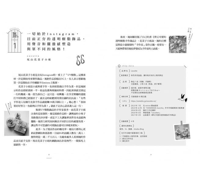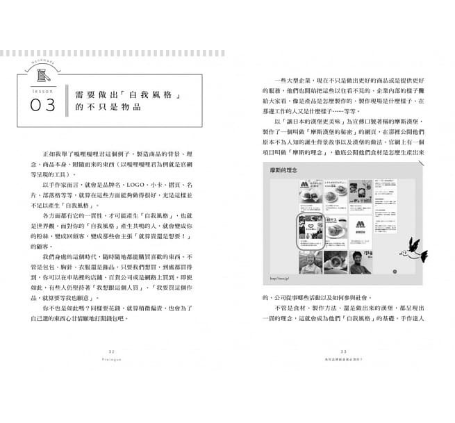 為了將喜歡做的事情能持續下去,就不再只是「讓顧客開心」這麼簡單了!在這本書裡面,可以看到每個創作者(或品牌)本身擁有的故事與特質,就像尚未開發的原石一樣,透過「風格的建立」、「尋找對的客群」、「銷售的方法」使大家了解如何在這個世代裡,讓自己的創作能夠散發出持久的光芒!──春豬工作室