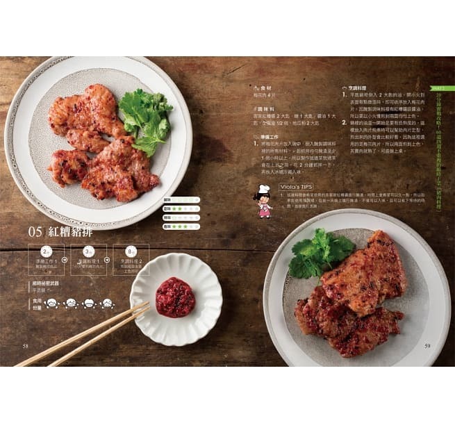 Viola從小耳濡目染,除了傳承了「媽媽的好味道」之外,也因為愛吃美食,喜歡親手為家人烹煮好料,更為了精進廚藝,還特別拜師學藝,勤奮地向阿基師、詹姆士等大廚們學做菜,從此練就出一身好手藝!而本書正是收錄了她把家傳的味道與大廚的祕方融合後,做出與別人不同的獨特味道,研發出專屬她個人風格的絕妙好滋味。