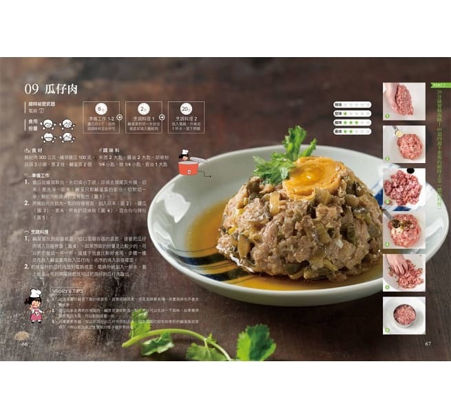 全書依照雞肉、豬肉、牛肉、海鮮分類共60道主菜,蔬菜、蛋、豆腐、菇分類共39道配菜,