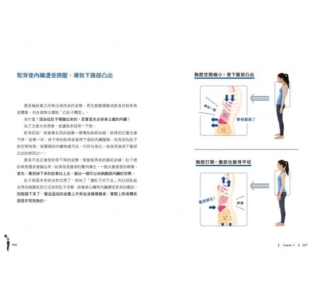 被重力壓扁的肌肉+下降的肋骨+擠成一團的內臟,這才是小腹的真相。收縮腹肌無法使小腹平坦,只是在凸出的肚子上再加上一層結實的肌肉。只要讓內臟和肋骨回歸原位,小腹就會自然消失不見。