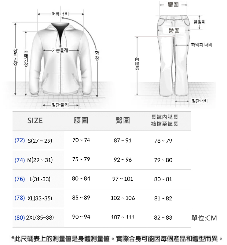 *此為品牌通用尺寸表,每款剪裁略有不同。