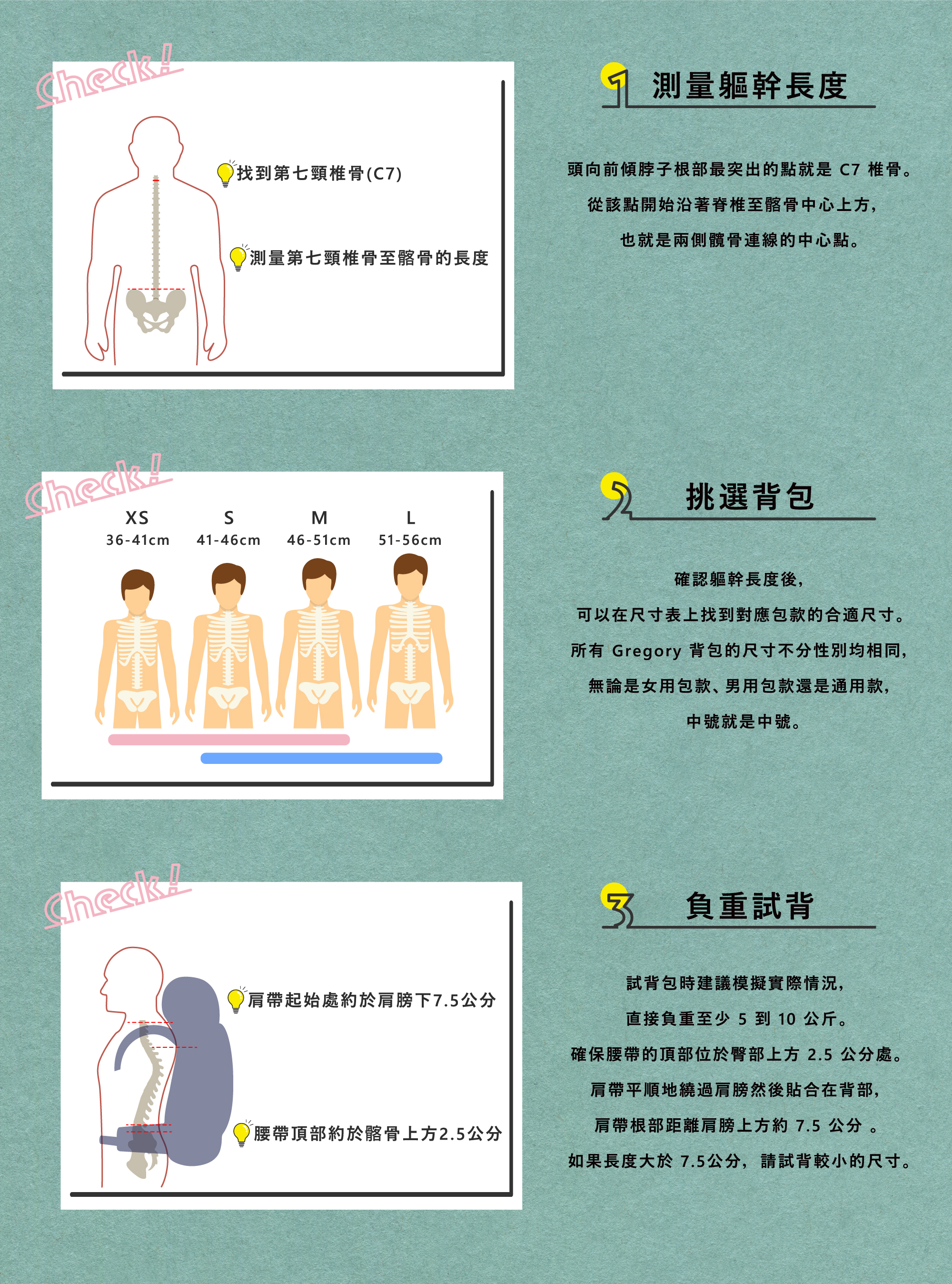 選擇尺寸正確的背包可以有更好的揹負體驗並減少能量的消耗,也可以讓包包的收納空間發揮最大效益。