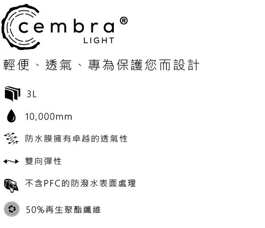 ★ 採用 cembra® LIGHT 材料製成,防水防風,由回收材料製成