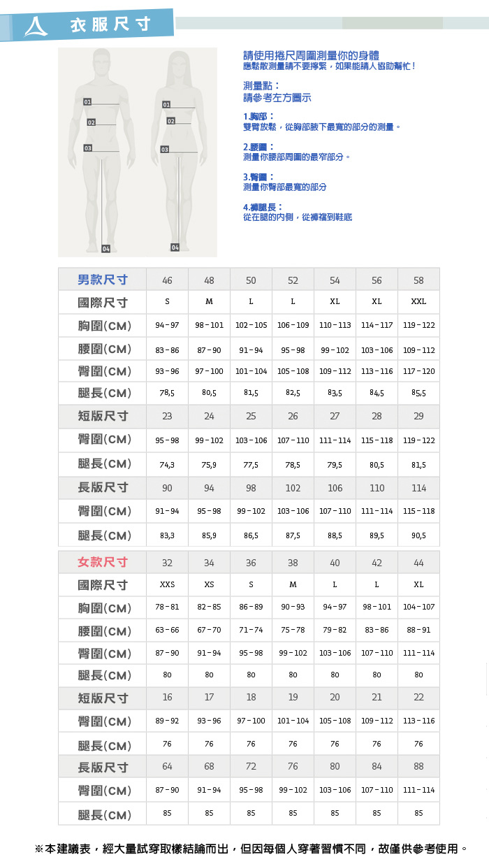 *此為品牌通用尺寸表,每款剪裁略有不同。