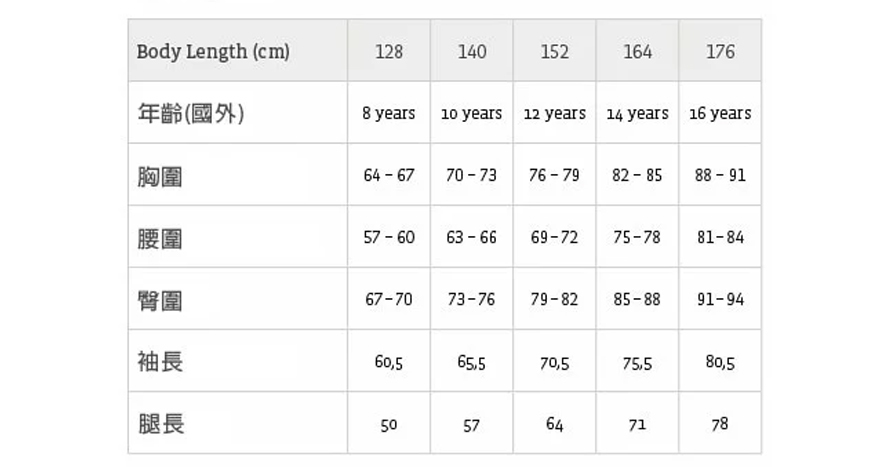 *此為品牌通用尺寸表,每款剪裁略有不同。