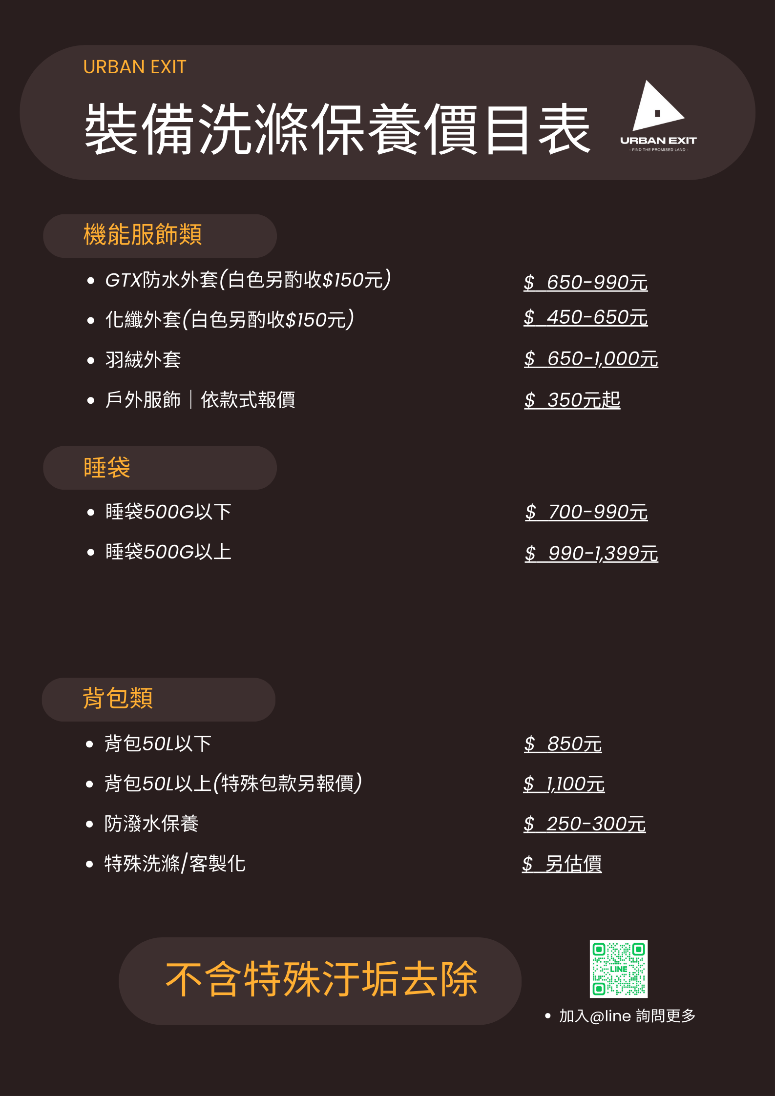 登山服飾裝備用久、放久難免都有破損或是洗不掉的頑固髒汙。相信大家都希望自己的裝備可以使用越久越好,不僅是因為環保,也為了珍惜每一個陪自己走過風風雨雨的裝備與回憶,更重要的是,登山裝備很貴啊!我們提供專業的維修和洗滌服務,延長寶貝服飾裝備使用期限~