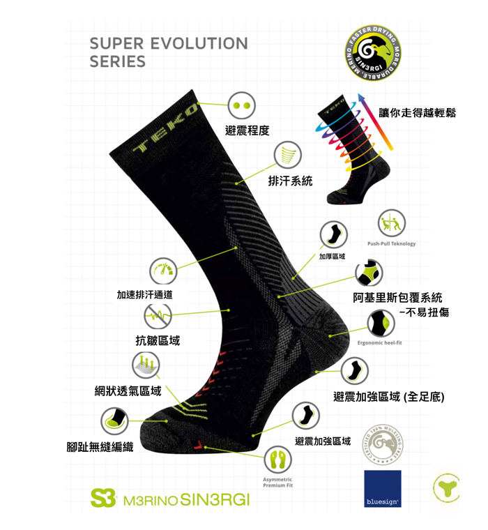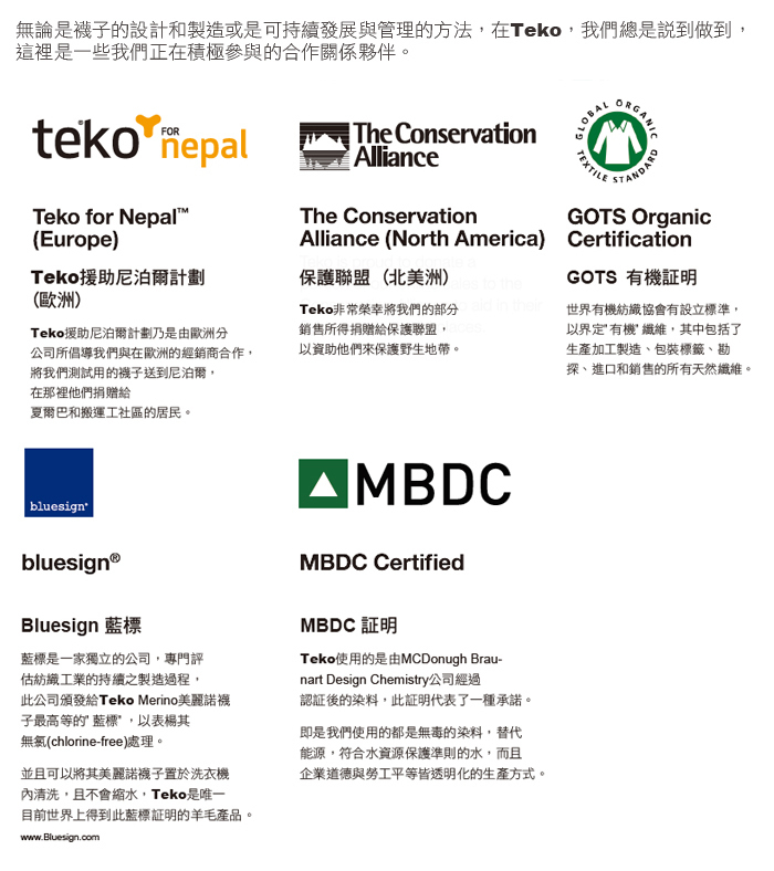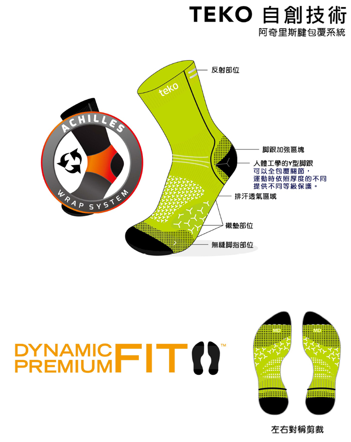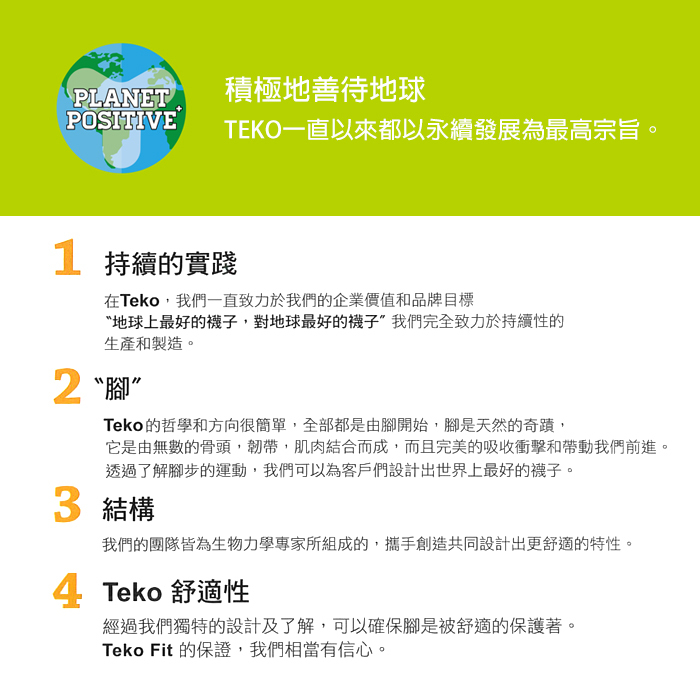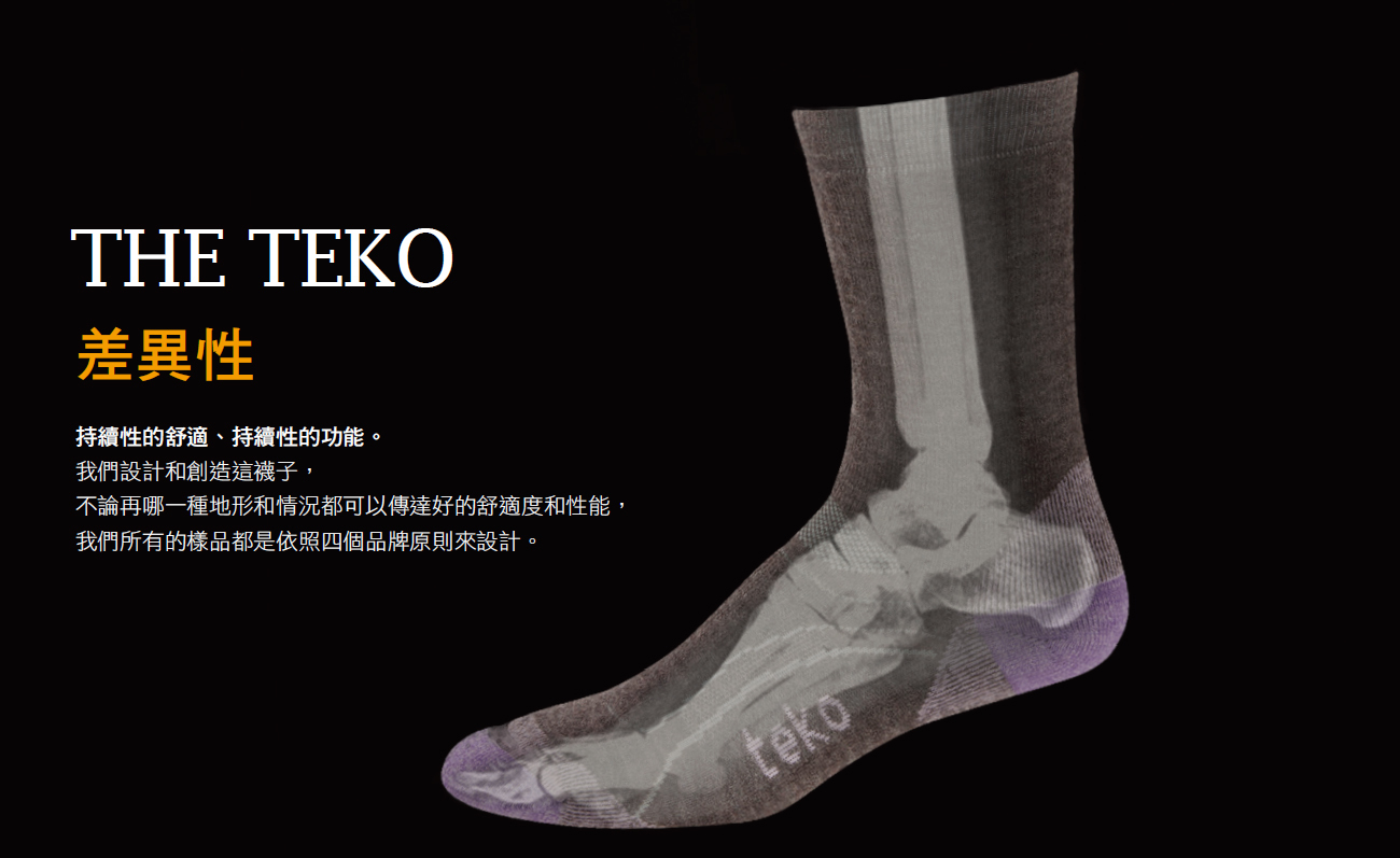 Teko專注於穿著的舒適度、合腳度以及機能性, 不斷研發兼具環保及機能性材質, 同時研發新的科技, 提升穿著舒適度以及機能表現