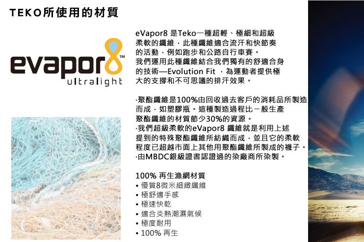 TEKO使用鬼網再生的尼龍材質所織成的Teko慢跑襪及腳踏車專用襪, 同時兼具強韌、輕薄、吸濕排汗機能和環保!