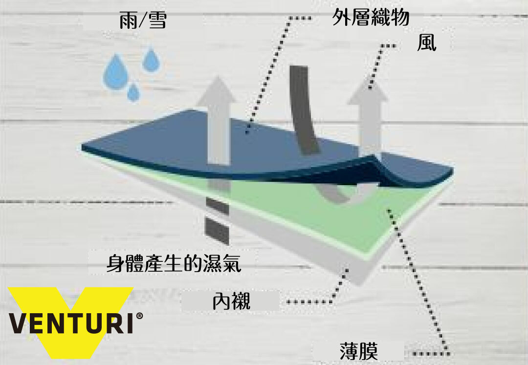 VENTURI 面料結構為粗與細孔洞結合,水蒸氣能通過粗孔洞擴散排出,成為可供水蒸氣循環的介面,所以水蒸氣會從濃度較高的地方飄蕩到濃度較低的地方。第二個先決條件是溫度梯度度,即外層的溫度必須低於衣服內的溫度,此種水蒸氣的輸送就是所稱的「透氣性」。