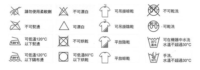 ※請依照材質種類和洗標選擇適當的洗滌方式。若不確定洗滌方式則盡量以手洗、使用中性洗劑為準則清洗。