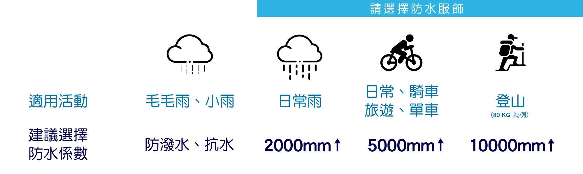 一般而言,防水外套不論遇到多大的雨勢,都能透過衣料的特性使水珠無法穿透,防止水分接觸皮膚。而表層的DWR防撥水塗層會隨時間逐漸耗損,但並不會影響布料本身的防水功能,因為防水外套的重點在於在於「防水薄膜」。