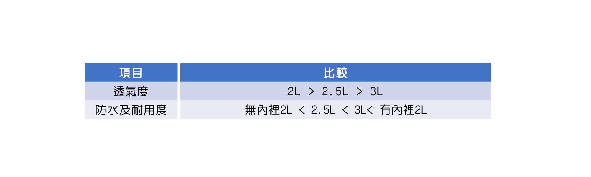 ※ 與皮膚接觸的舒適度視內裡布料而定,但與薄膜直接接觸會感到最悶濕難受、因此後來才研發出2.5L改善這問題,但都不如3L或2L+內裡布。