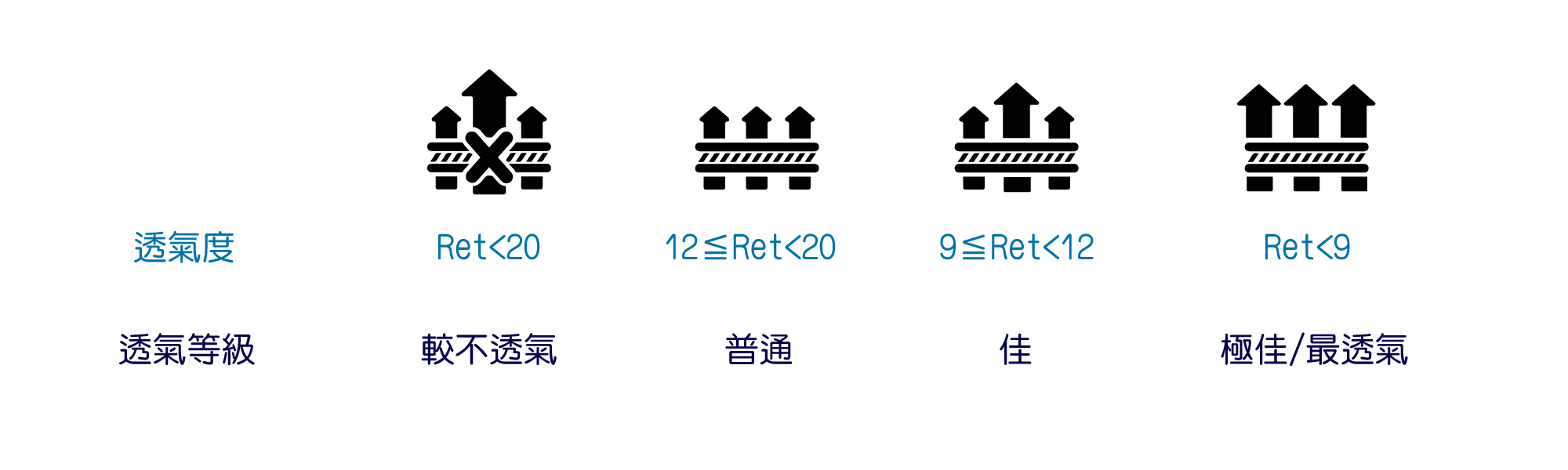 蒸發阻力試驗RET < 9 PA m²/W, 透濕度試驗MVTR 10,000 g/m²/24h