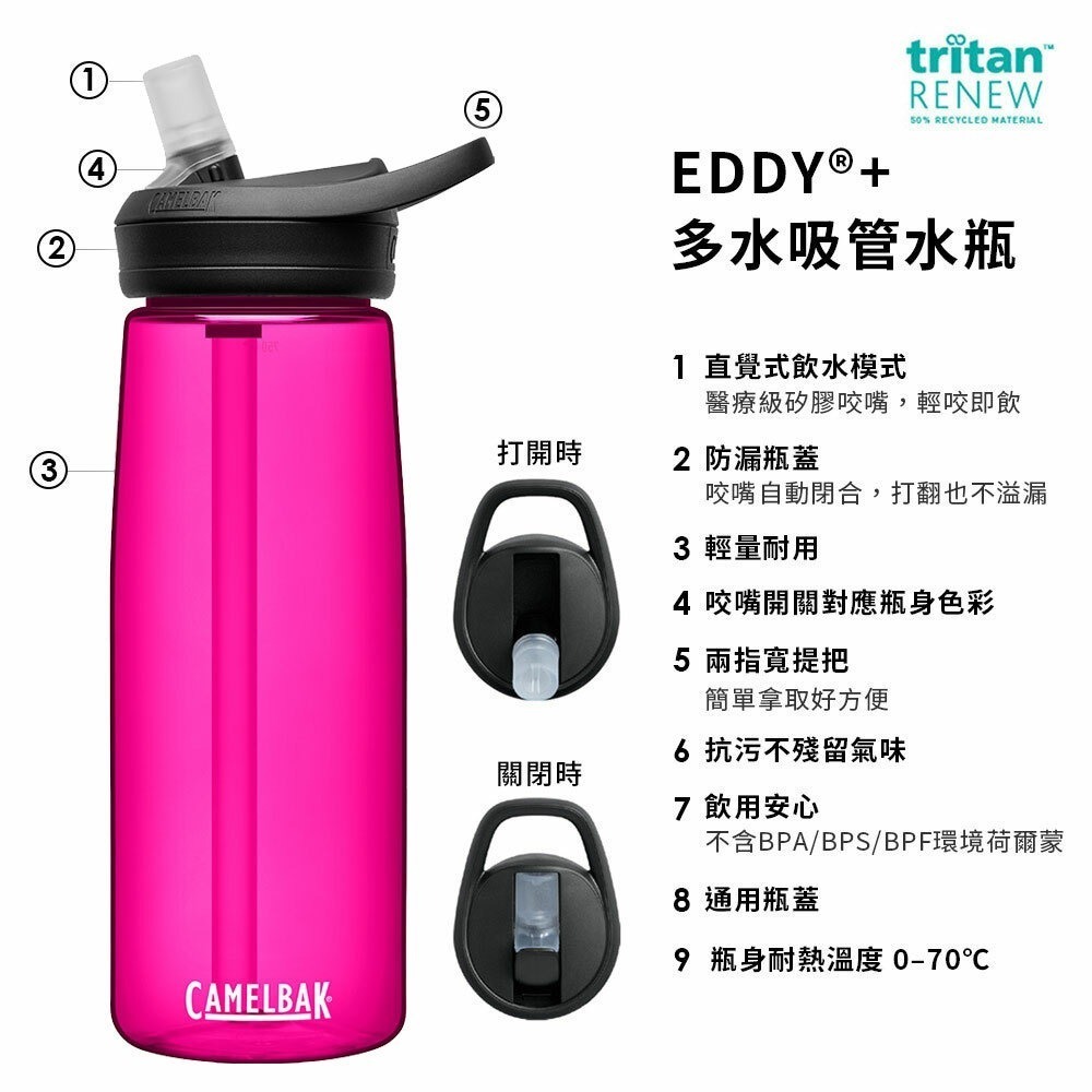 CamelBak 新推出 EDDY®+ 多水系列水瓶,全新水瓶形狀與色系,滿足每一位消費者的喜好與需求。瓶身以 TRITAN™RENEW (改質PCT),讓瓶身色彩飽度與透明度兼具,耐撞的特色適合戶外活動或日常生活使用。保證不含環境賀爾蒙 BPA「雙酚A」,並通過歐盟食品容器規範,印有可以與食物接觸的『杯叉標誌』,使用起來安心、安全無負擔!頂蓋一體成行熱塑提把,可方便手持手持或用扣勾環將水壺掛在背包上,攜帶方便!