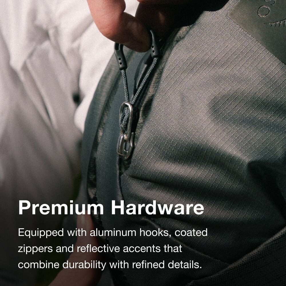 採用原始鋁鉤、塗層拉鍊和反光裝飾,兼具耐用性和精緻細節,提升了每件產品的功能性和風格。