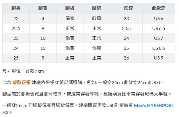 一般穿26cm 但腳板偏寬且腳背偏厚,建議購買男款US8鞋楦較寬 Men's HYPERPORT H2。