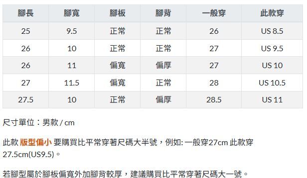 版型偏小,寬腳板建議購買比平常大半號例如: 一般穿27cm 此款穿27.5cm(US9.5)