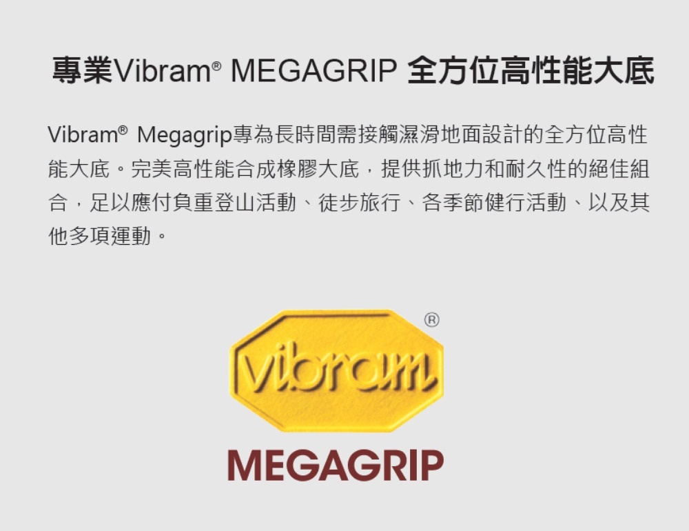 • Vibram® TC5+橡膠大底+山型刻痕設計,提供優異的戶外多種運動活動抓地力
