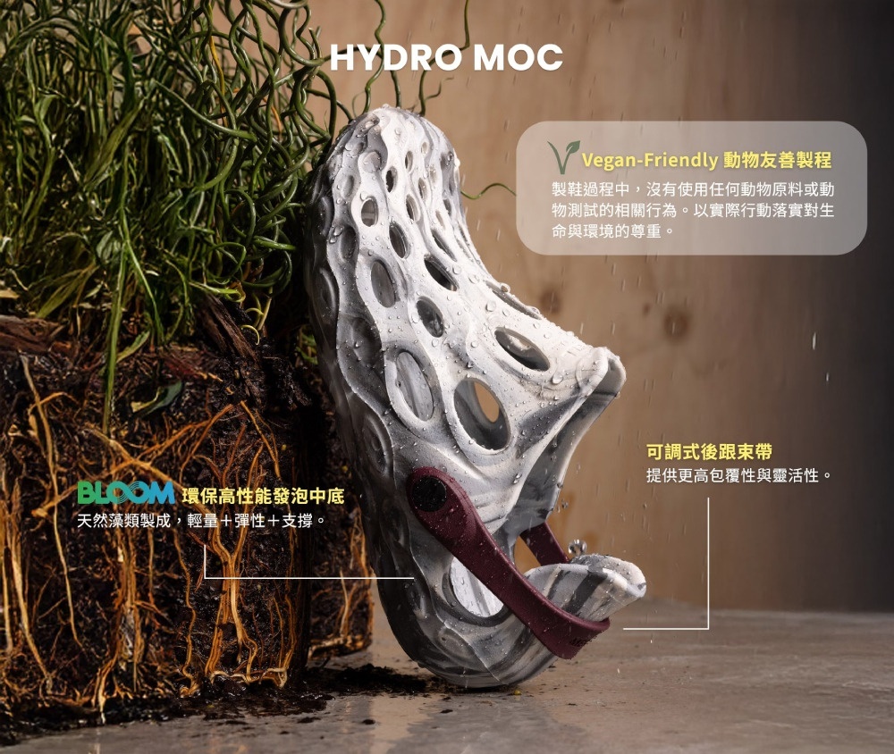 • BLOOM®高性能發泡中底,由藻類生物製成, 在製造過程中能將湖水轉化為清潔水源