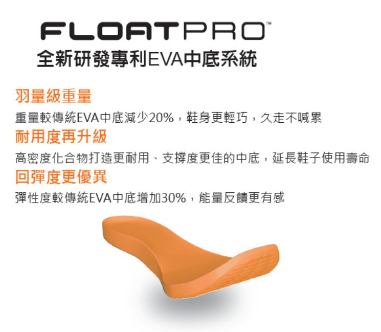 •FloatPro™羽量級中底,提供持久的輕盈舒適感