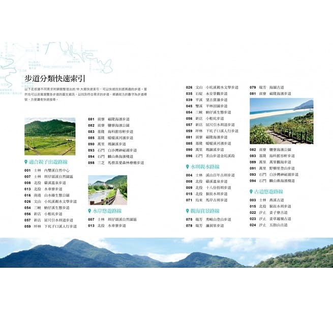 收錄近三年全新設立的私房步道、口耳相傳的熱門路線、土石泥路的原始山徑……不分男女老少都能輕鬆出遊,更適合喜歡全新路線的你。