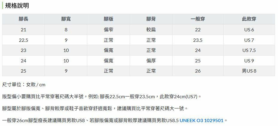 版型偏小,請購買比平常穿著尺碼大半號;腳版偏寬或腳背較厚建議購買比平常穿著尺碼大一號。