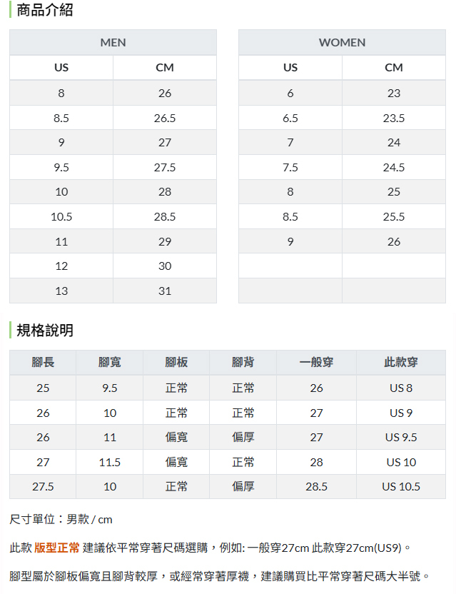 此款 版型正常 建議依平常穿著尺碼選購,例如: 一般穿27cm 此款穿27cm(US9)。