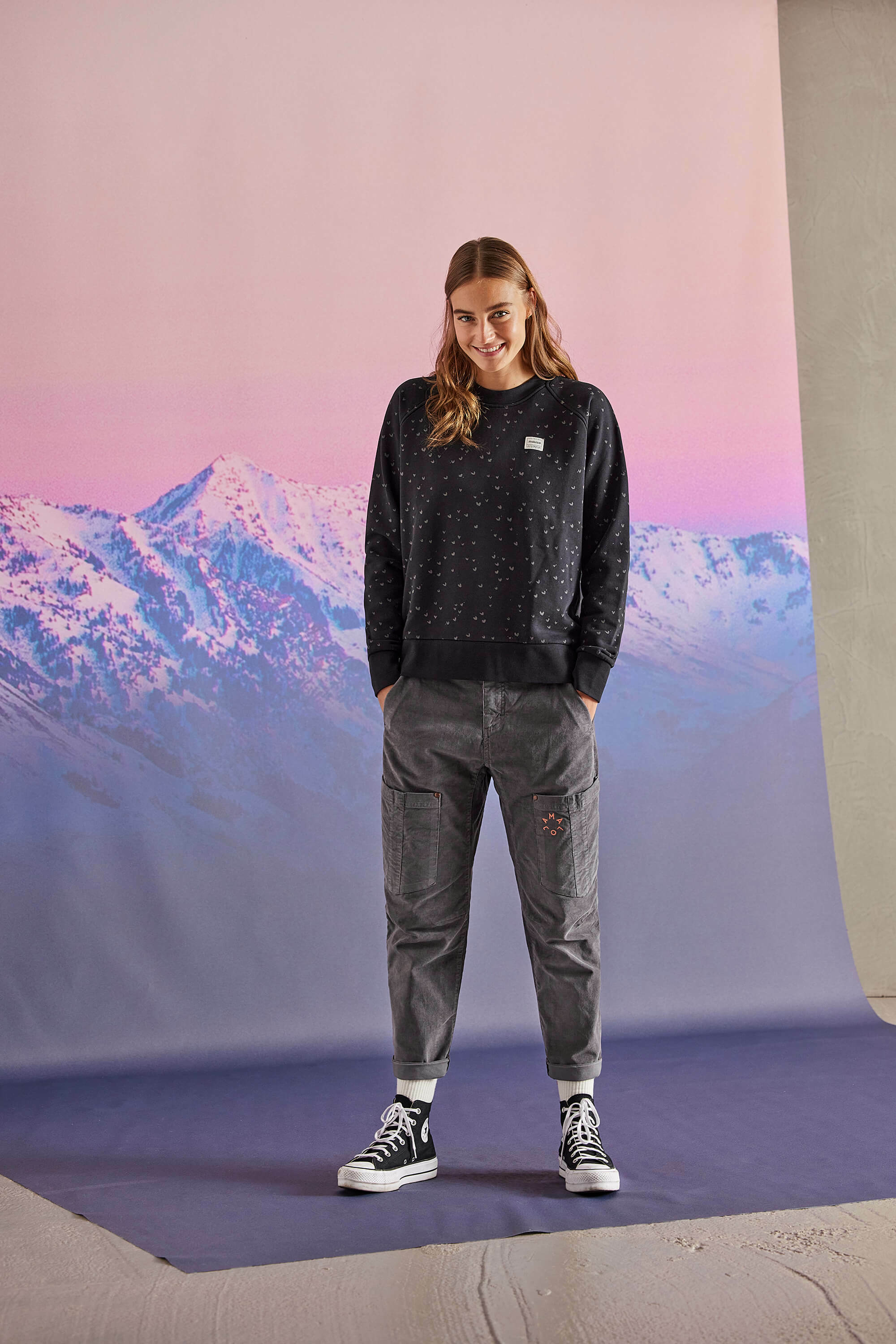 有機棉燈芯絨工裝長褲,前斜插袋及大腿前側環形 Maloja logo 印花大口袋設計。