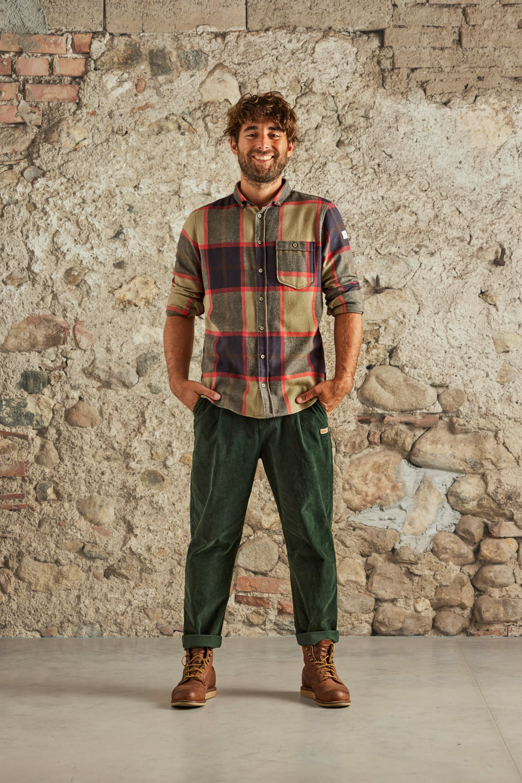 寬鬆有機棉燈芯絨褲子,有兩個褶皺,正面有斜貼邊口袋,背面有雙鈕扣口袋。