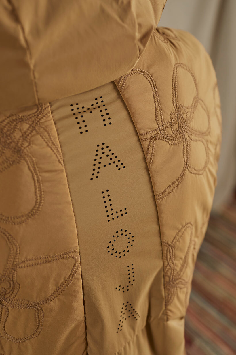 固定填充物的衍縫以特別的花卉線條設計,是 Good Morrow 系列工作坊的作品。