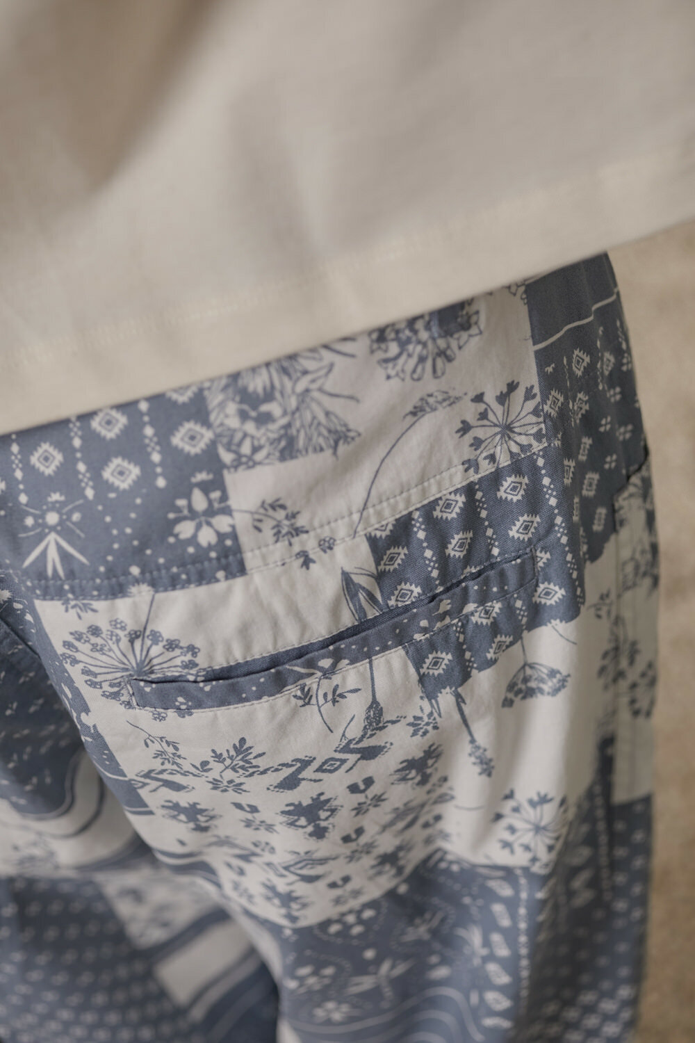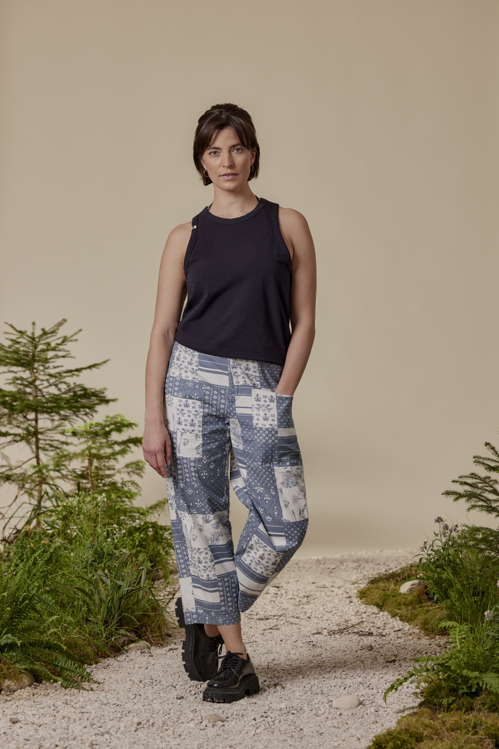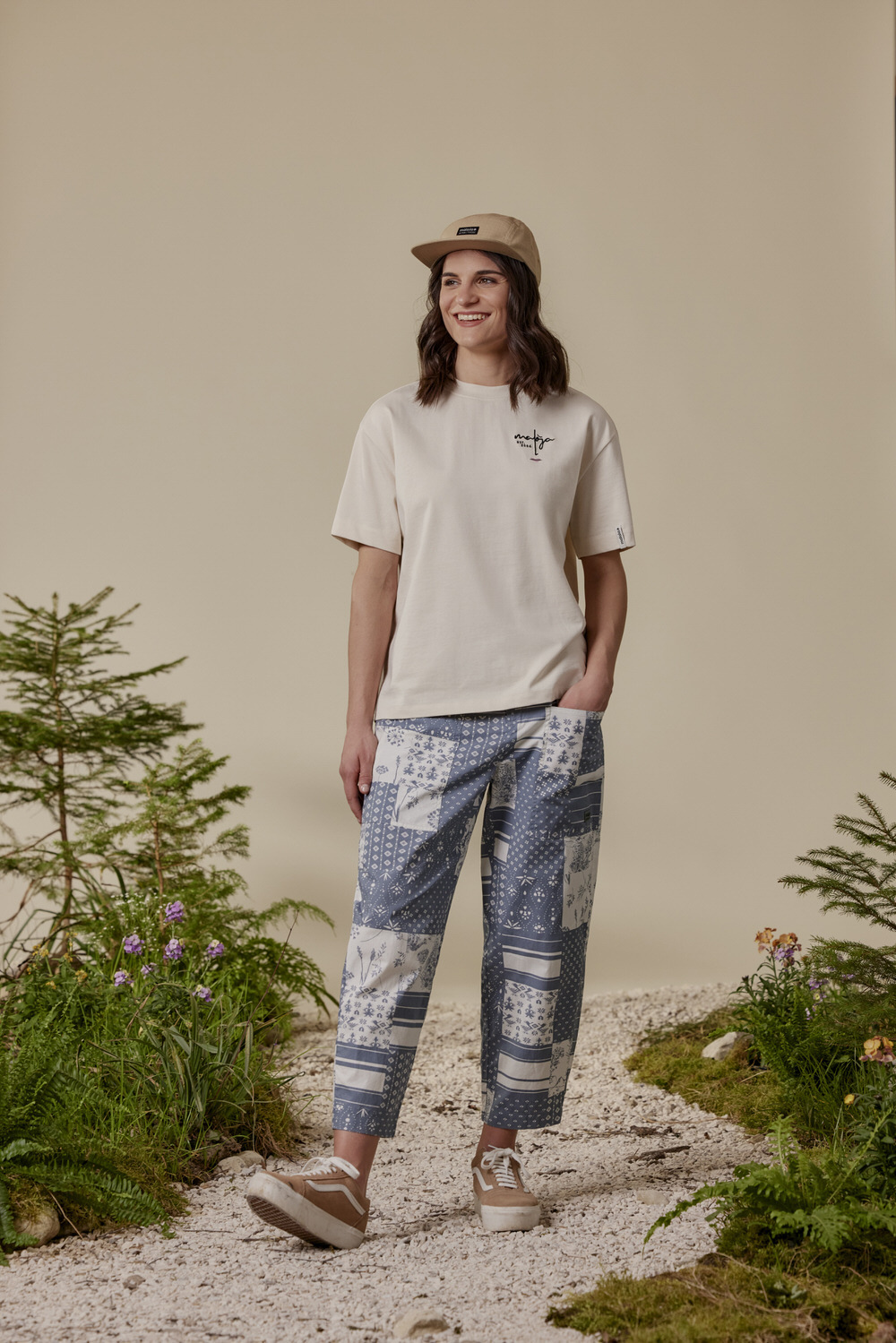 有機棉寬鬆長褲。大腿處口袋和褲管略短的九分褲版型呈現出簡約獨特、慵懶舒適的特色。滿版印花將花卉圖案與各種圖形元素結合在,是 LA VIA 系列的新設計。