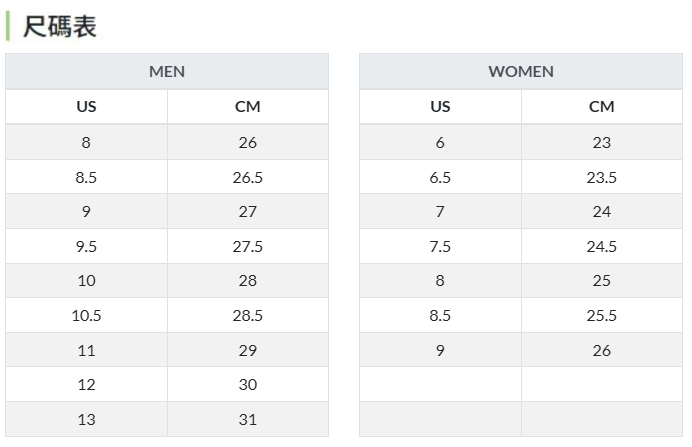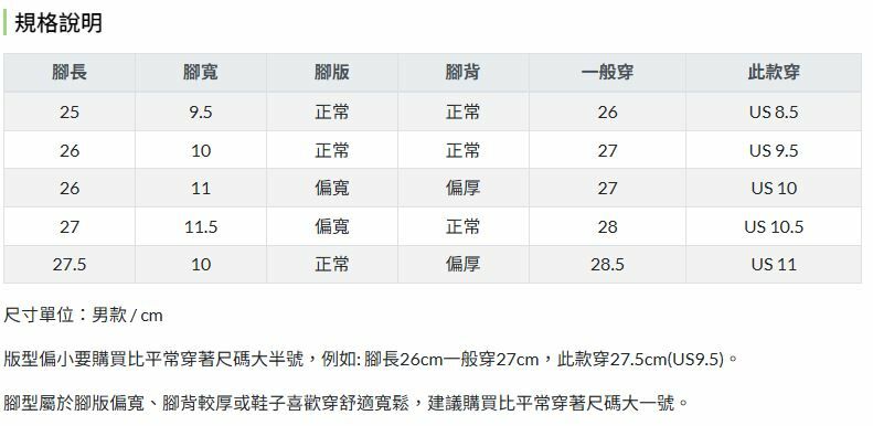 版型偏小要購買比平常穿著尺碼大半號,例如: 腳長26cm一般穿27cm,此款穿27.5cm(US9.5)。