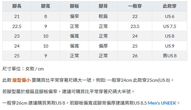 版型偏小,請購買比平常穿著尺碼大半號;腳版偏寬或腳背較厚建議購買比平常穿著尺碼大一號。
