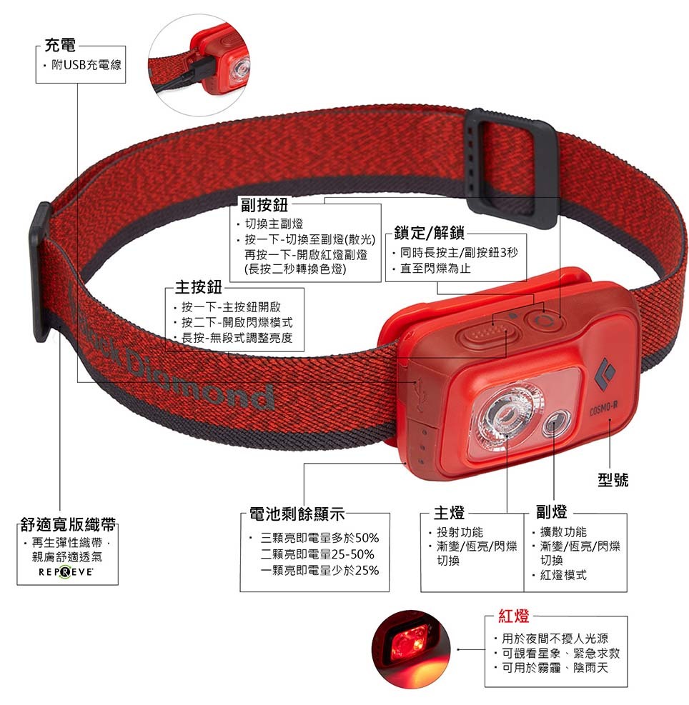 相信登山的朋友都同意紅光的重要性,畢竟在山屋裡面被白光照到眼睛真的是很不舒服的一件事情,此款頭燈簡約但保留紅光功能,滿足登山者對於頭燈的最低需求