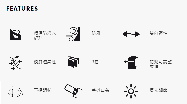 Stormshell Light材質防風且外層覆有不含 PFC的防潑水材質,表布防潑水材質經 PFC-free 處理。