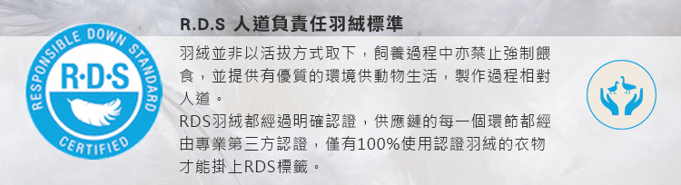 ■ 採用 RDS 認證的人道羽絨認證,製作過程相對人道,讓您穿的保暖又安心