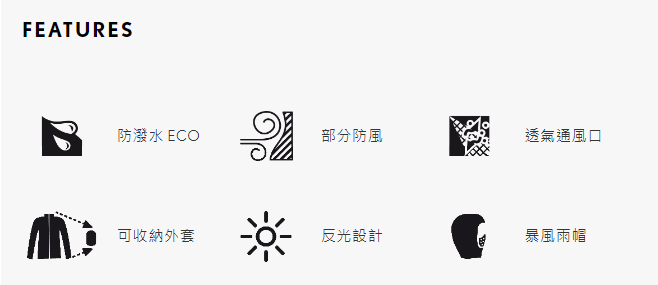 袖口及帽兜的反光材質提升在暗處的可視度,背部及側邊的網布可以調節熱能和排汗。