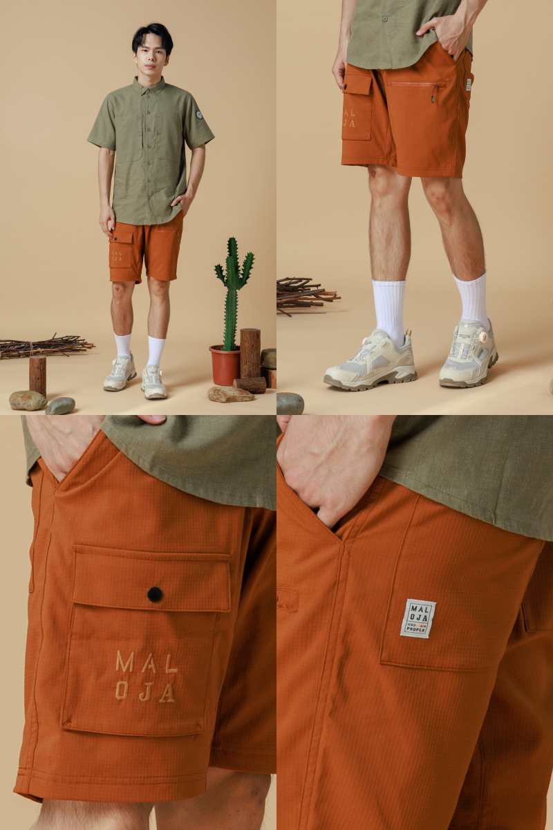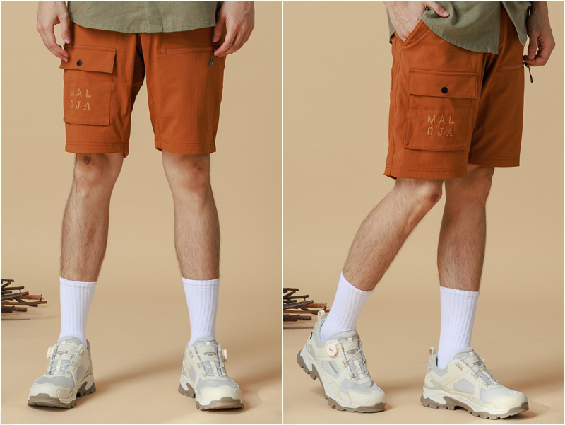 產品採用的耐磨布料質感扎實且舒適。右後方口袋上有方形Maloja布章。