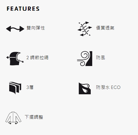 彈性Stormshell Light材料防風且無PFC防潑水塗層。