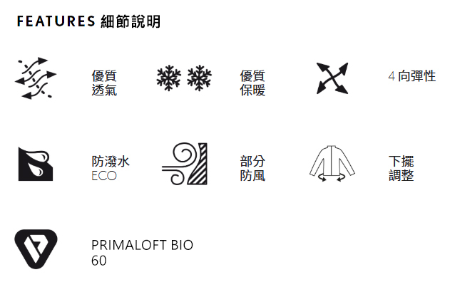 採用異材質拼接,將彈性的雙層伸縮材料應用於下半部分,並在領口、前胸和背部使用 PrimaLoft® BIO,