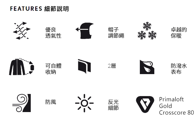 外套可收納到內至拉鏈網袋中,便於攜帶非常適合旅行、滑雪和各種戶外活動。