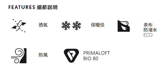 PrimaLoft® BIO 保暖襯衫式外套,外層表布經 PFC-Free 處理,具有防風和防潑水性能。