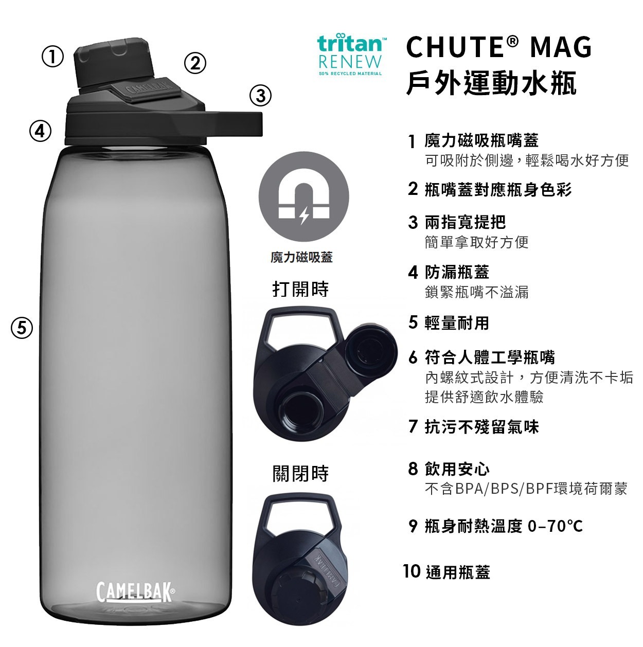 無論何時何地,CamelBak CHUTE® MAG戶外運動水瓶系列提供您快速便利的飲水。不同於市場上單純的水瓶,CHUTE® MAG戶外運動水瓶改良飲水口的設計,內螺紋方便不卡垢,全新設計的磁力瓶嘴蓋可吸附於側邊,讓您暢快飲用,一體成型的兩指寬熱塑提把設計,方便您隨時攜帶。