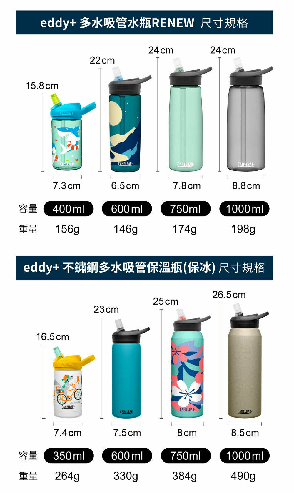 CamelBak 新推出 EDDY®+ 多水系列水瓶,全新水瓶形狀與色系,滿足每一位消費者的喜好與需求。瓶身以 TRITAN™RENEW (改質PCT),讓瓶身色彩飽度與透明度兼具,耐撞的特色適合戶外活動或日常生活使用。保證不含環境賀爾蒙 BPA「雙酚A」,並通過歐盟食品容器規範,印有可以與食物接觸的『杯叉標誌』,使用起來安心、安全無負擔!頂蓋一體成行熱塑提把,可方便手持手持或用扣勾環將水壺掛在背包上,攜帶方便!
