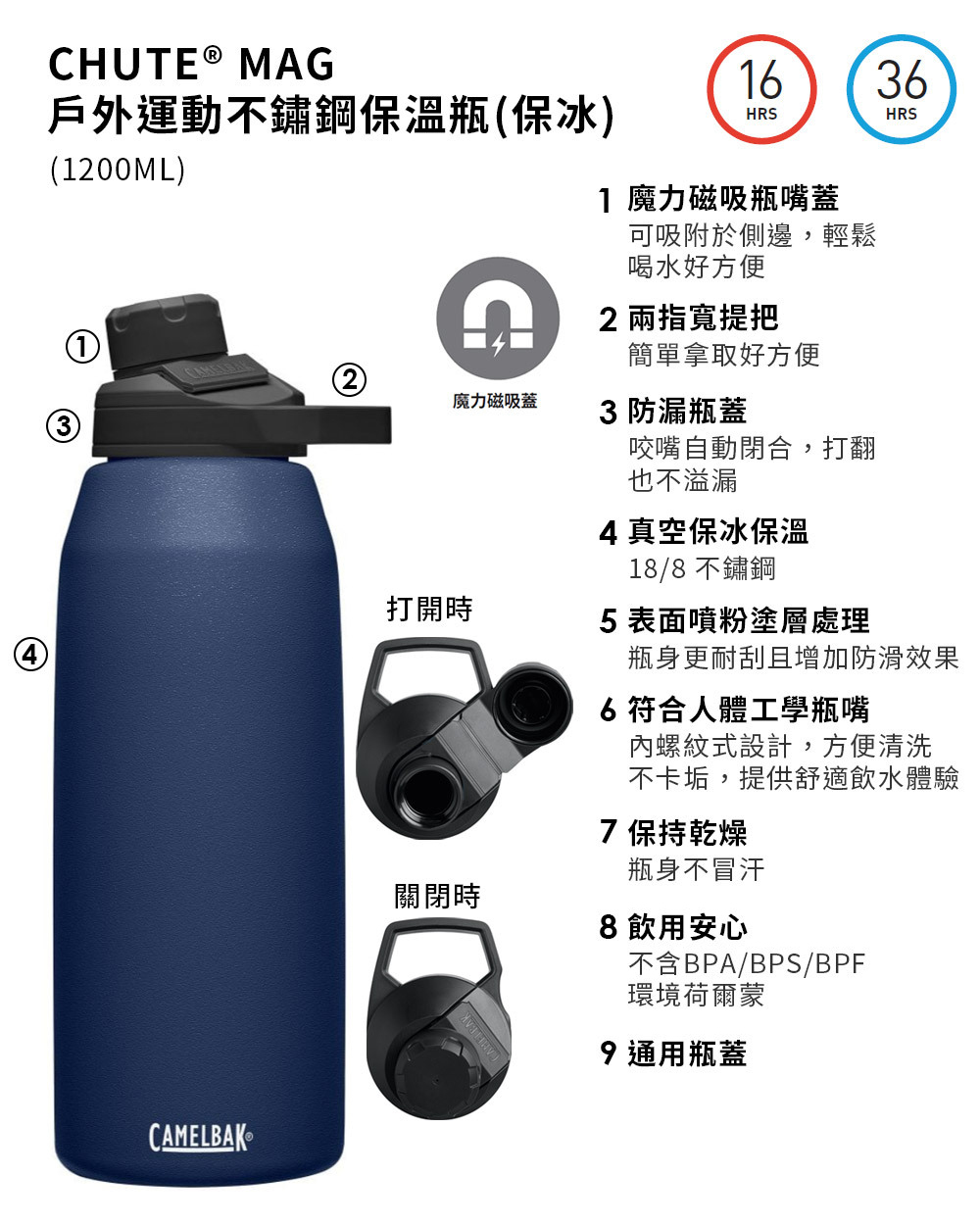 無論何時何地,CamelBak CHUTE® MAG戶外運動水瓶系列提供您快速便利的飲水。不同於市場上單純的水瓶,CHUTE® MAG戶外運動水瓶改良飲水口的設計,內螺紋方便不卡垢,全新設計的磁力瓶嘴蓋可吸附於側邊,讓您暢快飲用,一體成型的兩指寬熱塑提把設計,方便您隨時攜帶。