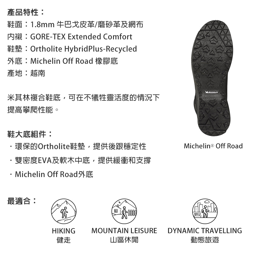 這款經典的輕量中筒鞋非常適合高山健行、日常山區生活及動態旅遊時穿著。耐用舒適的牛巴戈皮革鞋面採用GORE-TEX薄膜技術,可提供持久的防水保護。米其林越野大底可在不犧牲靈活性的情況下提高攀爬性能。