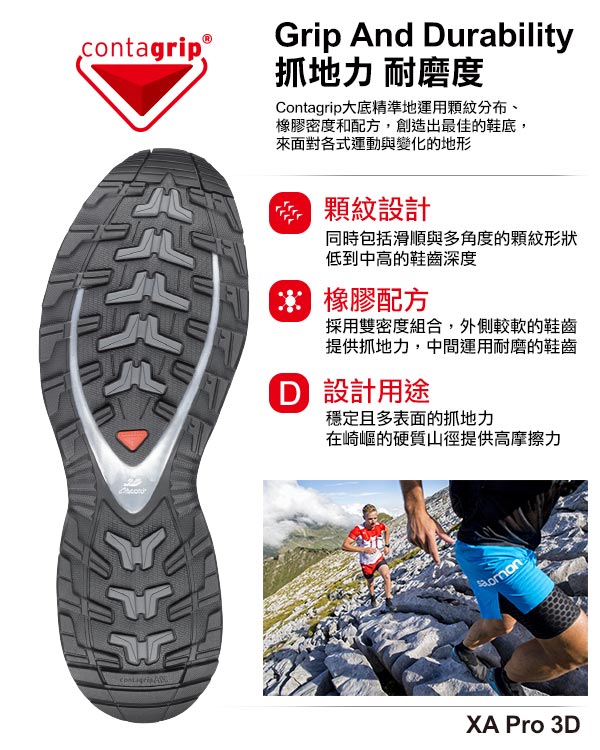 在抓地和耐用表現優異,大底的特殊刻紋設計和全地形適用的ContaGrip大底,具有較佳的黏性。